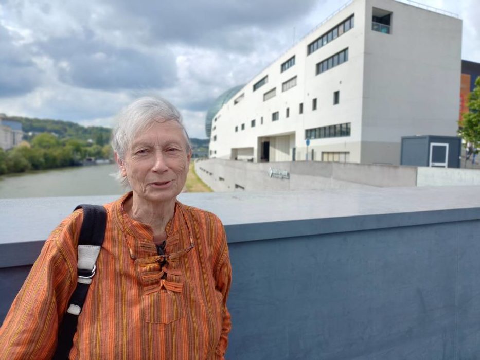 la joueuse de vielle devant la Seine Musicale